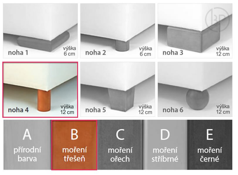 Nožka postele je dřevěná v barevném provedení třešeň,vysoká 12 cm.Tj. provedení 4-B, viz obrázek.