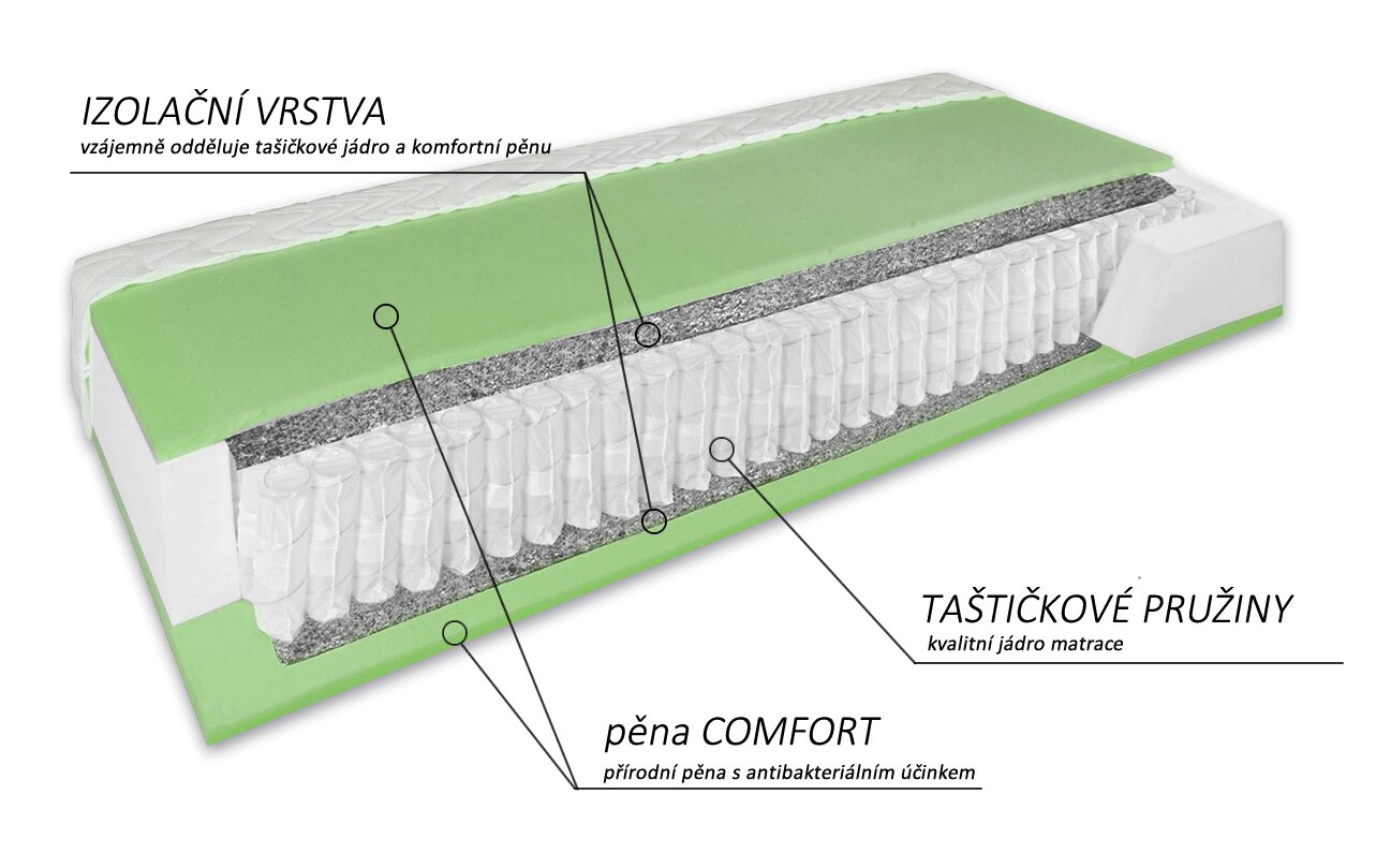 Na korpusu postele leží lamelový dřevěný rám obsahující vzdušné pružinové jádro, vrstvu pěny a dutého vlákna a vše je začalouněnou pevnou textílií.