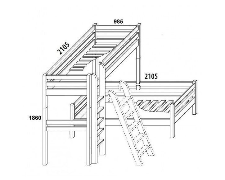 Dětská postel se vyznačuje vysokou kvalitou zpracování a zaujme zajímavým designem ve tvaru L. K výstupu na palandu slouží pohodlný dřevěný žebřík, který je v ceně postele.