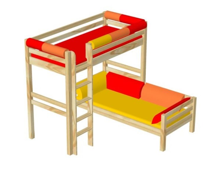 Dětská postel se vyznačuje vysokou kvalitou zpracování a zaujme zajímavým designem ve tvaru L. K výstupu na tuto patrovou postel slouží pohodlný dřevěný žebřík, který je v ceně postele. Žebřík může být libovolně umístněn na pravé nebo levé straně postele, navíc si můžete vybrat, jestli má být šikmý, rovný nebo s otvory.