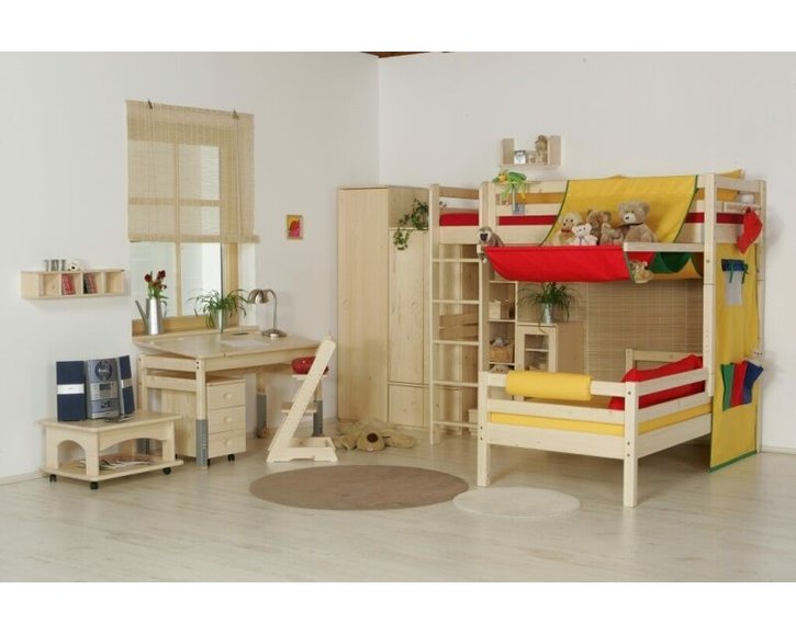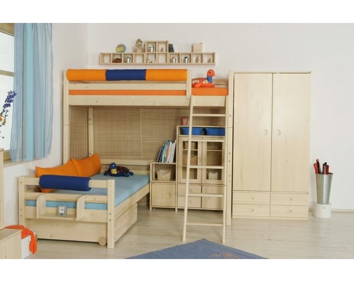 Pod spodní postel je možné umístnit úložné prostory. Pro malé děti můžete na spodní postel nasadit přenosnou dětskou zábranu. Horní postel je opatřena zábranou jako ochrana proti pádu. Pro větší pohodlí můžete zábrany opatřit látkovými chrániči.