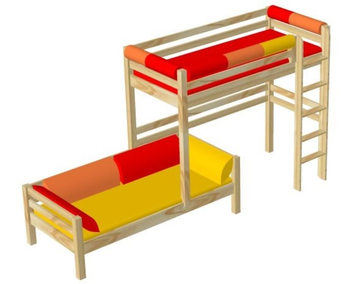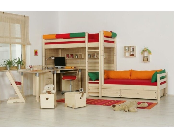 Horní postel je opatřena zábranou jako ochrana proti pádu. Pro malé děti můžete na spodní postel nasadit přenosnou dětskou zábranu. Pod spodní postel je možné umístnit úložné prostory.