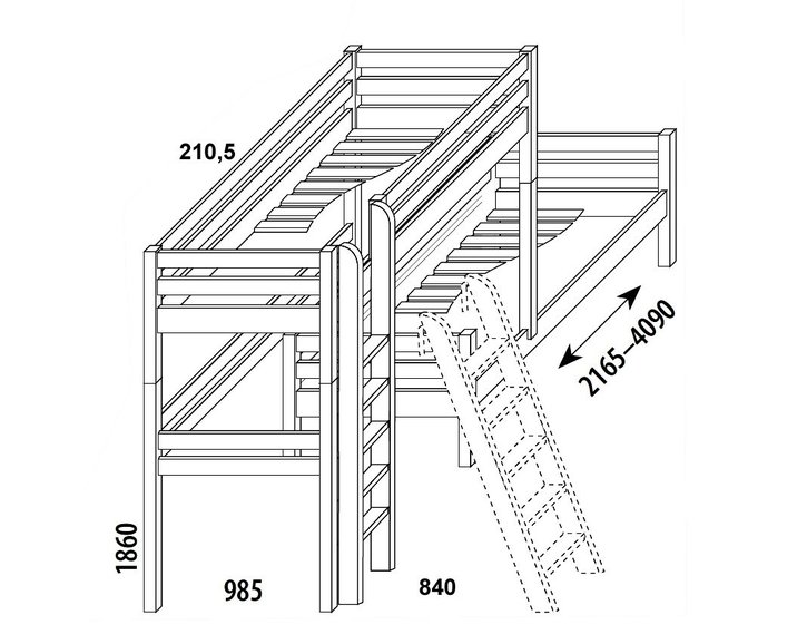 K výstupu na postel slouží pohodlný dřevěný žebřík, který může být libovolně umístněn na pravé nebo levé straně postele. Navíc si můžete vybrat, jestli má být rovný nebo šikmý. Bezpečnost výstupu je u zvýšených postelí a paland docílena speciální protiskluzovou úpravou.