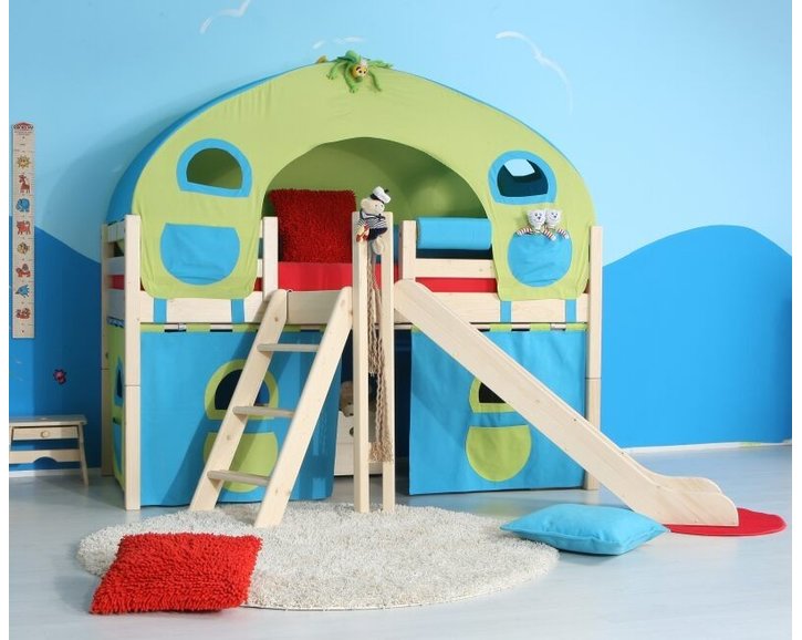 Textilní dekorace nejsou součástí ceny postele. Jako příslušenství doporučujeme k dokoupit látkový stan a domeček v kombinaci tyrkyso-zelené barvě.