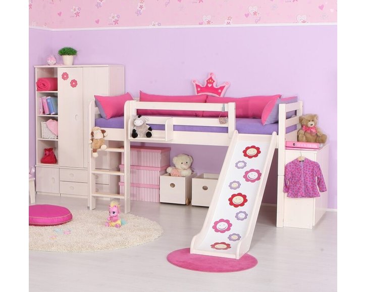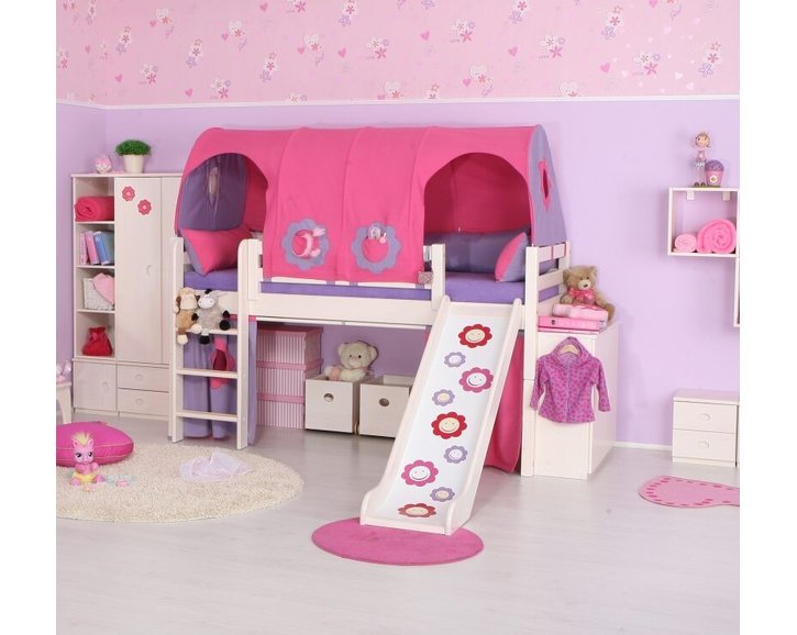 Textilní dekorace nejsou součástí ceny postele. Jako příslušenství doporučujeme dokoupit látkový stan a domeček, které jsou vyrobeny v růžovo-fialové barvě a budou krásným doplňkem dívčího pokoje. Látkový domeček poskytuje dětem k jejich hrám potřebný pocit soukromí.
