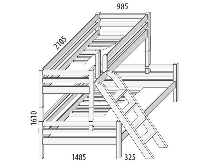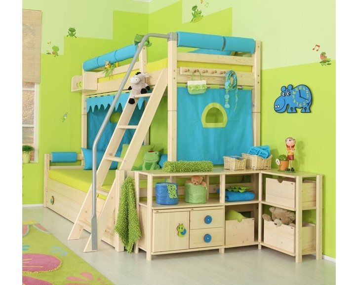 Tuto dětskou postel pro 2 děti je možné rozložit na dvě samostatně stojící. Pod spodní postel je možno umístnit úložné prostory. Pro malé děti můžete na spodní postel nasadit přenosnou dětskou zábranu na postel.