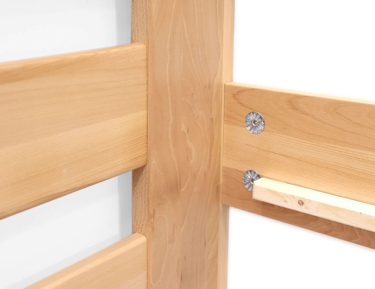 Povrchová úprava ekologickým lakem je u MIVY provedena velmi precizně, dřevo je hladké a příjemné na dotek. Rohové spojení pomocí dvojitého šroubového kování hodnotím jako velmi pevné a spolehlivé řešení, díky kterému postel drží stabilitu i při dlouhodobém zatížení. Pokud bych měl zmínit drobný kompromis, pak je to absence výškově stavitelného kování pro rošty, ale v této konstrukční a cenové kategorii dává stávající řešení dobrý smysl a podporuje celkovou tuhost rámu.