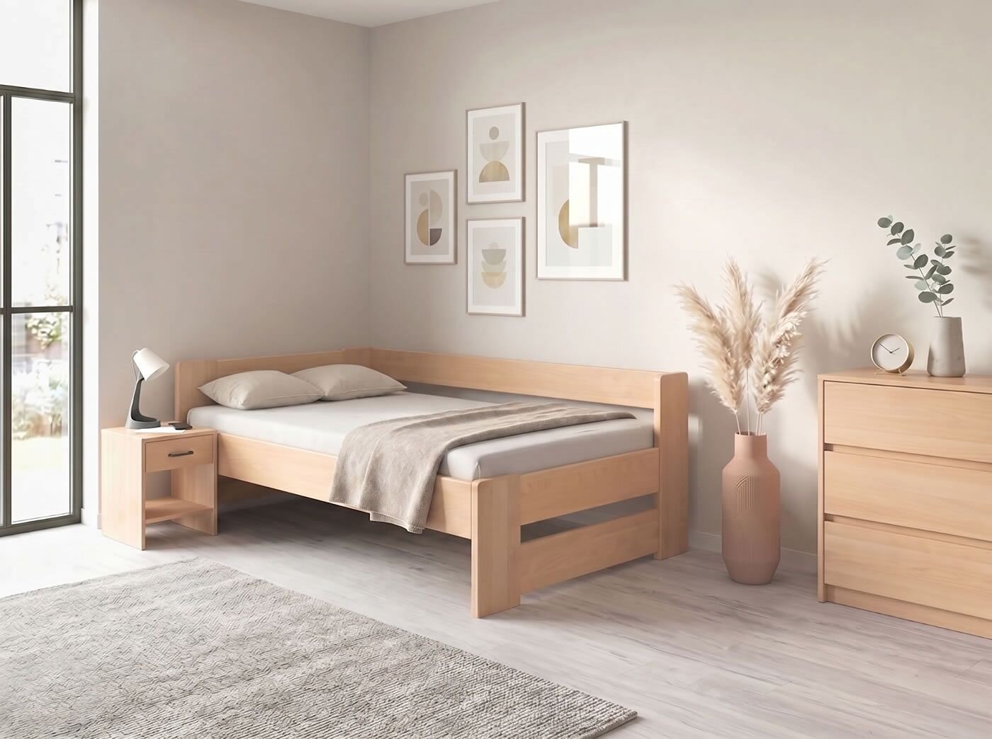Na posteli MIVA oceňuji zejména kombinaci průběžného bukového masivu (žádný cink/parketové provedení) a konstrukce bez zbytečných komplikací. Právě absence úložného prostoru je v tomto případě výhodou – postel působí vzdušněji, lehčeji a konstrukčně velmi čistě.