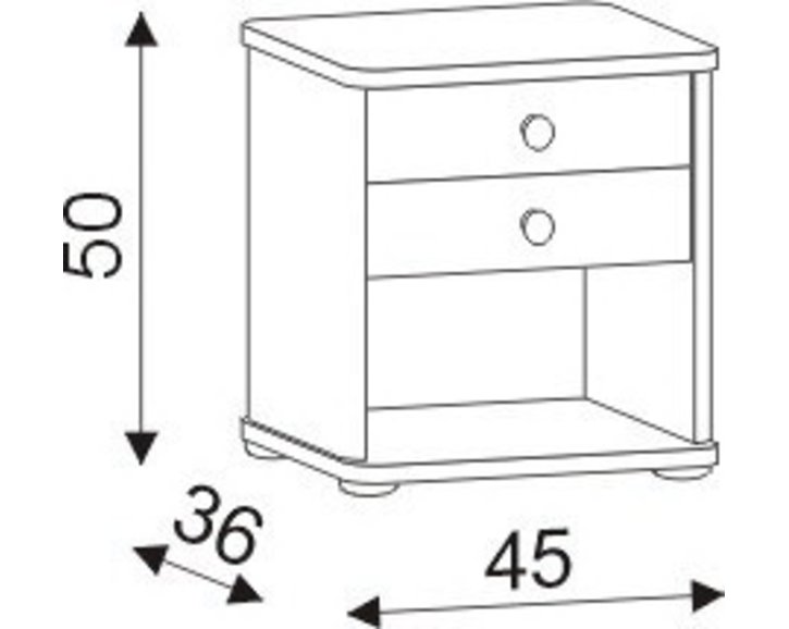 Noční stolek je vybaven dvěmi praktickými zásuvkami, které jsou opatřeny dřevěnou úchytkou. Pod zásuvkou se nachází praktický úložný prostor pro vaše věci, které potřebujete mít v ložnici po ruce.
