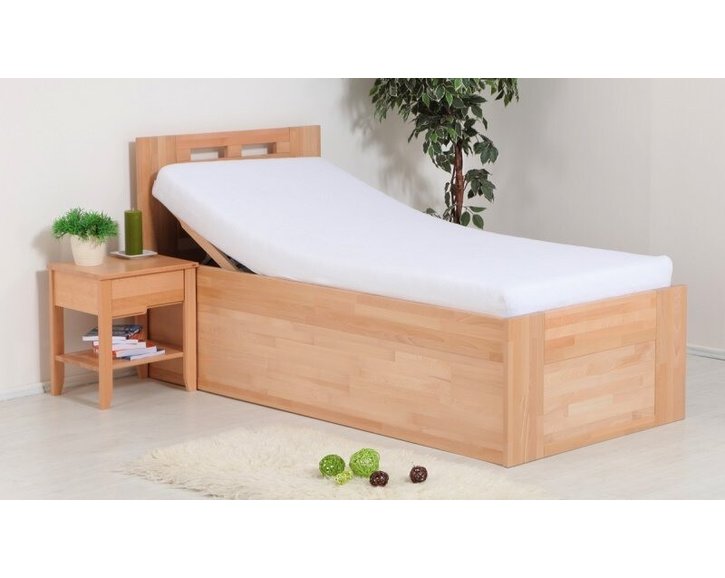 Jednolůžko s úložným prostorem Valencia Senior patří mezi oblíbené modely v našem oddělení postele s úložným prostorem. Tato postel je vyrobena z masivního bukového dřeva v tzv. cinku, nebo-li parketovém provedení ( dřevěné desky jsou vyrobeny slepením menších dílů - parket ). Díky velkému úložnému prostoru, přístupnému pomocí vyklápěcích lamelových roštů plní tato postel funkci praktičnosti a představuje zároveň moderní design.