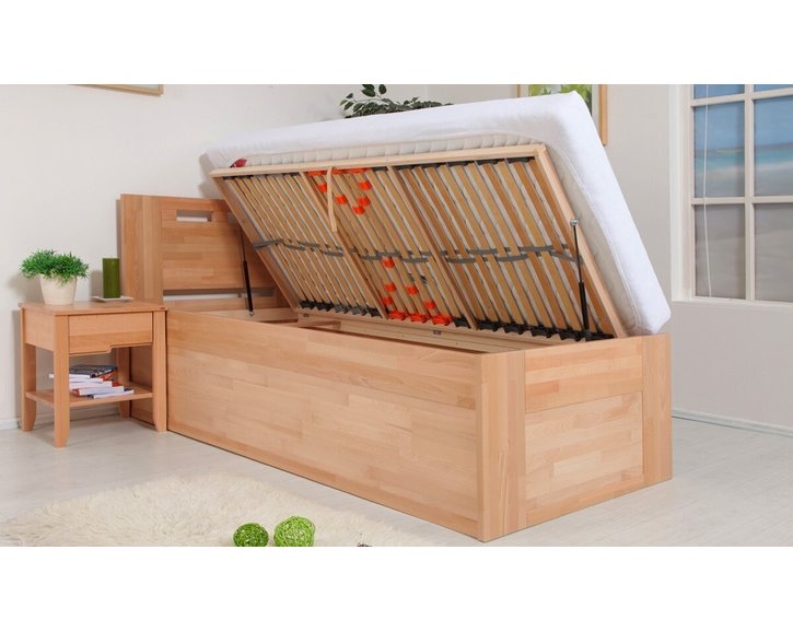 Jednolůžko s úložným prostorem a bočně vyklápěcím roštem Valencia Senior patří mezi oblíbené modely v našem oddělení postele s úložným prostorem. Tato postel je vyrobena z masivního bukového dřeva v tzv. cinku, nebo-li parketovém provedení ( dřevěné desky jsou vyrobeny slepením menších dílů - parket ). Díky velkému úložnému prostoru, přístupnému pomocí vyklápěcího lamelového roštu plní tato postel funkci praktičnosti a představuje zároveň moderní design.