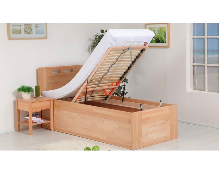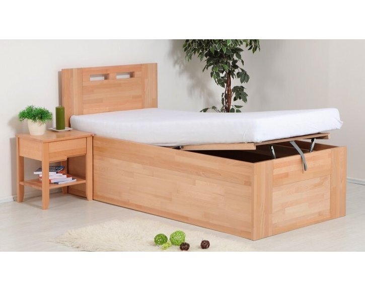 Jednolůžko s úložným prostorem a čelně výklopným roštem Valencia Senior patří mezi oblíbené modely v našem oddělení postele s úložným prostorem. Tato postel je vyrobena z masivního bukového dřeva v tzv. cinku, nebo-li parketovém provedení ( dřevěné desky jsou vyrobeny slepením menších dílů - parket ). Díky velkému úložnému prostoru, přístupnému pomocí vyklápěcího lamelového roštu plní tato postel funkci praktičnosti a představuje zároveň moderní design.