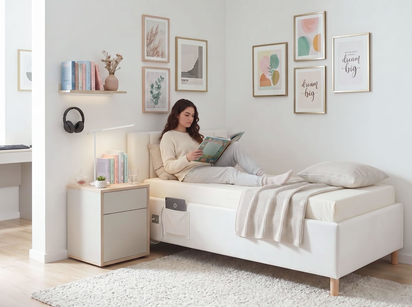 Třešničkou na dortu jsou duální USB porty (včetně moderního USB-C) a praktická boční kapsa na AirPad / Galaxy / Mobil / Knihy či časopisy . Pokud hledáte multifunkční, odolnou a technologicky připravenou postel, která vyřeší i nedostatek úložného prostoru, mohu Dock jednoznačně doporučit."
