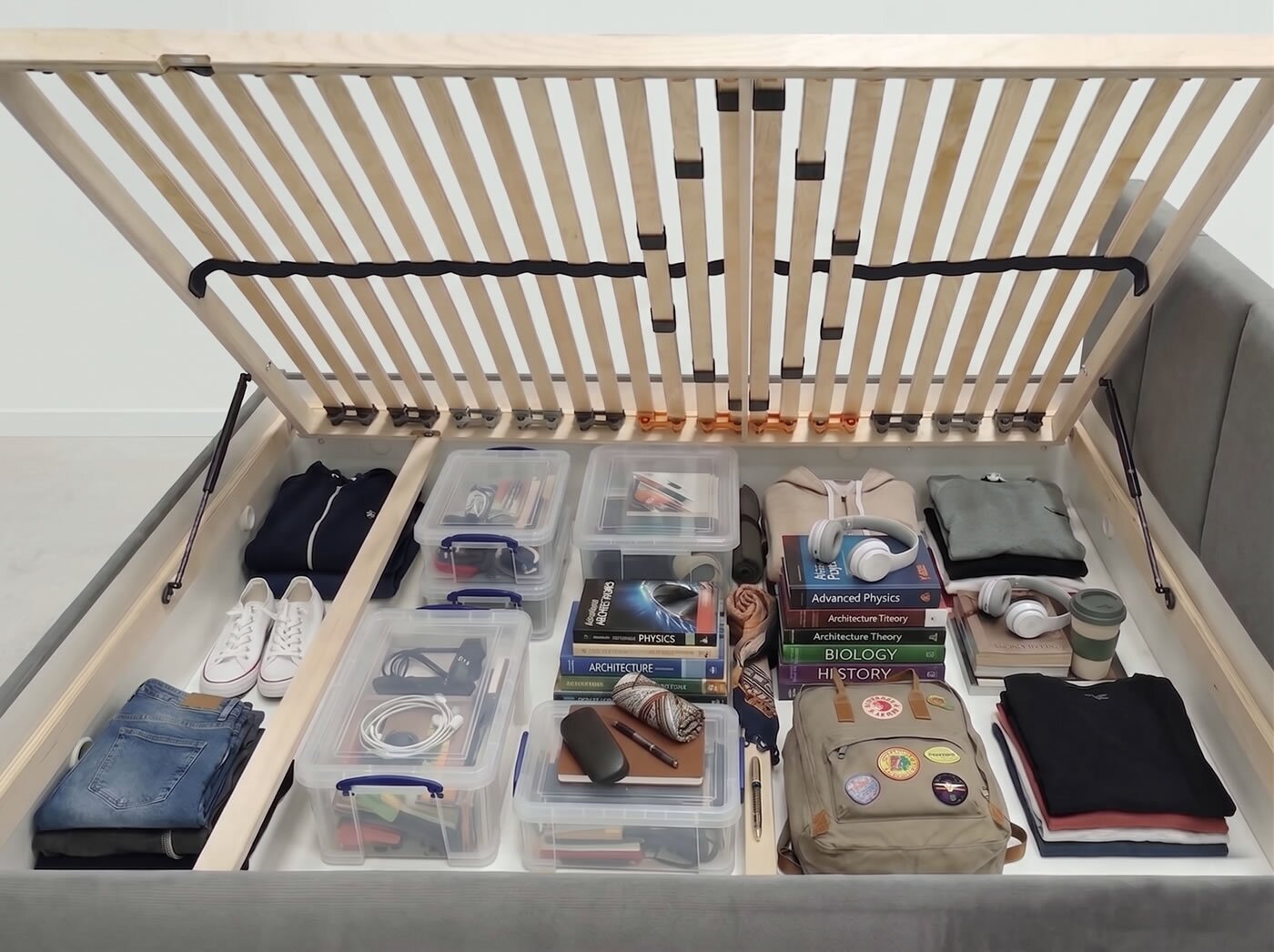 Zásadní předností je obrovský úložný prostor s vysokou nosností. Na rozdíl od běžných modelů si Dock hravě poradí i s 20 Kg zátěží, přičemž přístup pomocí vyklápěcích roštů maximálně usnadňují kvalitní plynové vzpěry.