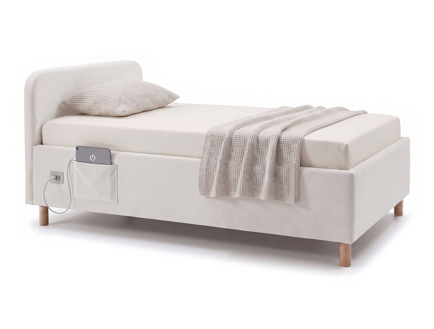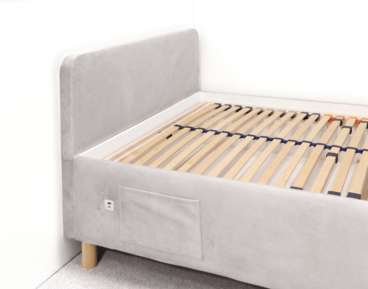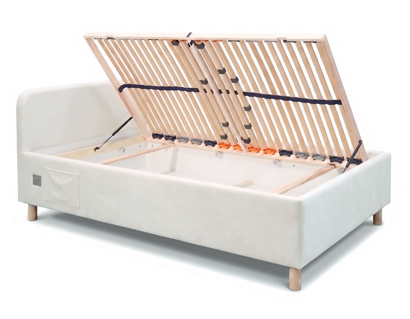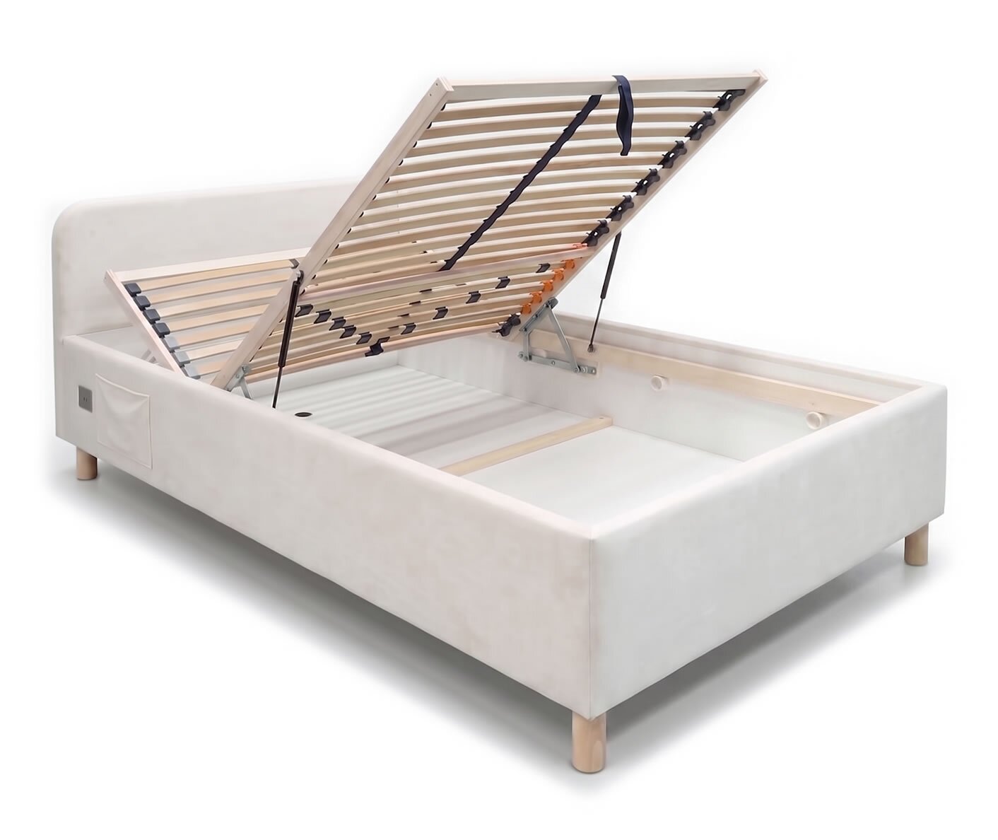 Základní cena postele je za rám včetně hlavového čela, roštu, úložné kapsy a integrované USB nabíječky. Součástí nejsou matrace a dekorace. Do postele je ideální použít matraci 90x200 cm.