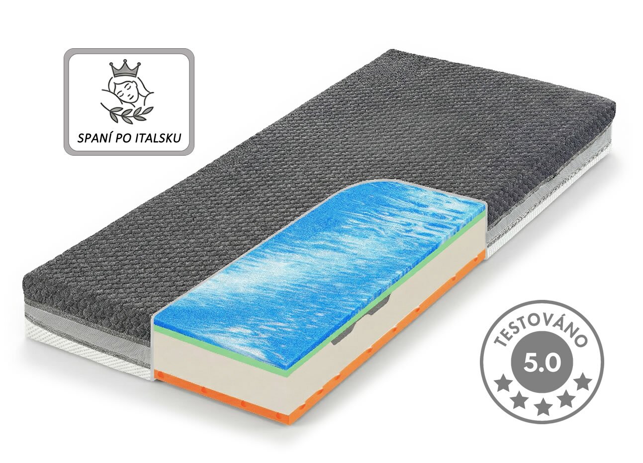 Výška 25 cm, nosnost 150 kg, 5 let záruka na jádro,latex-gelová pěna, designový potah
