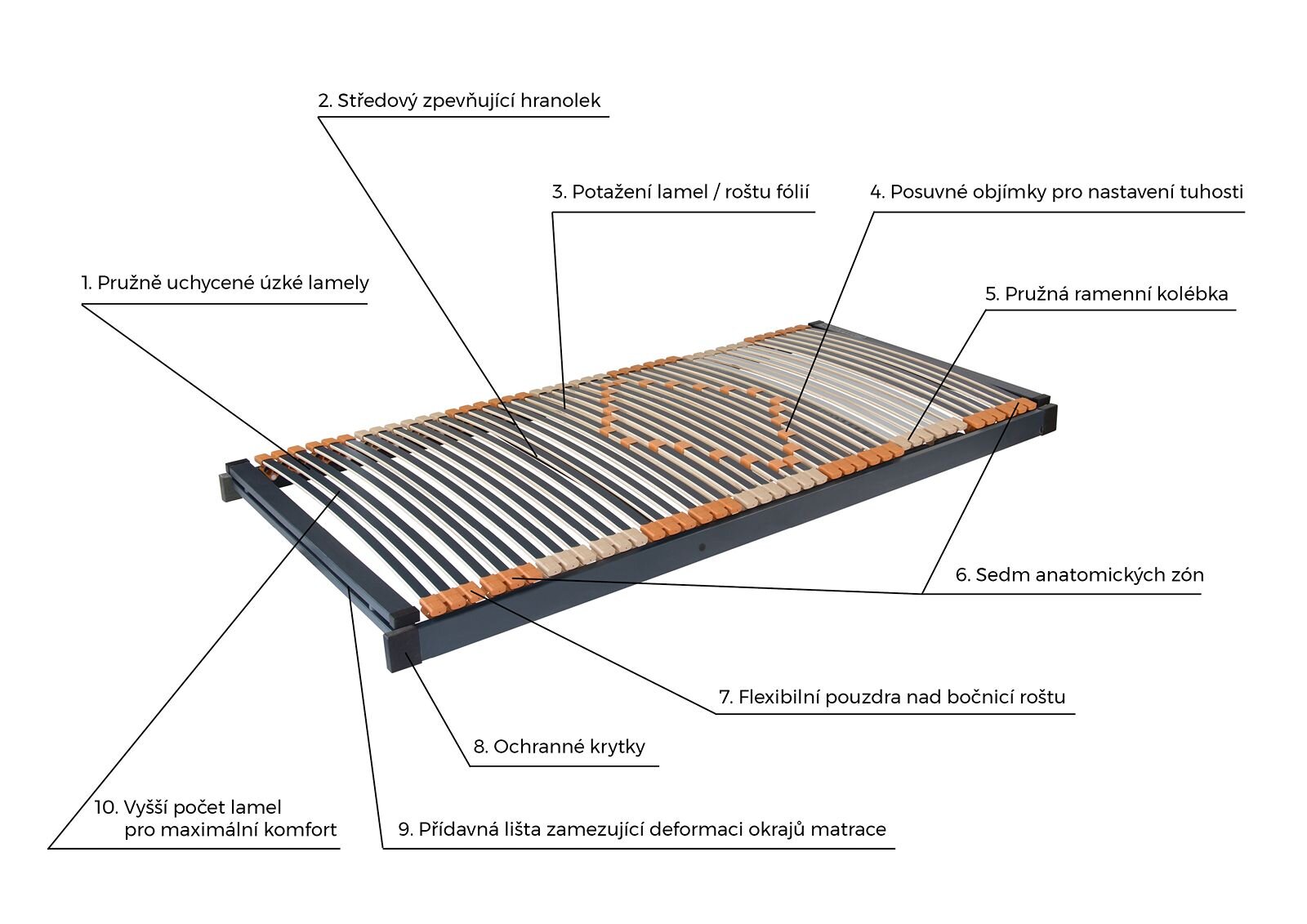 - Hygiena a ochrana díky fólii: Povrch lamel je potažen speciální fólií, která usnadňuje údržbu, odpuzuje prach a vlhkost a chrání potah matrace před zatrháváním.