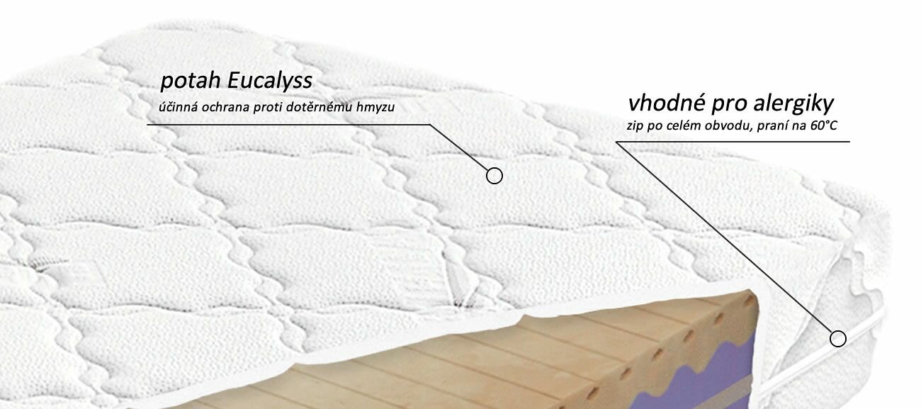 Potah Eucalyss využívá jedno z nejúčinnějších přírodních řešení – 100% přírodní výtažek z Eucalyptus Citriodora. Díky této úpravě látka účinně odpuzuje dotěrný hmyz, zejména komáry. Účinnost byla ověřena testy v renomované laboratoři v Anglet ve Francii, takže během klidného a hlubokého spánku pomáhá ve vaší ložnici vytvářet pomyslnou „bezletovou zónu“.