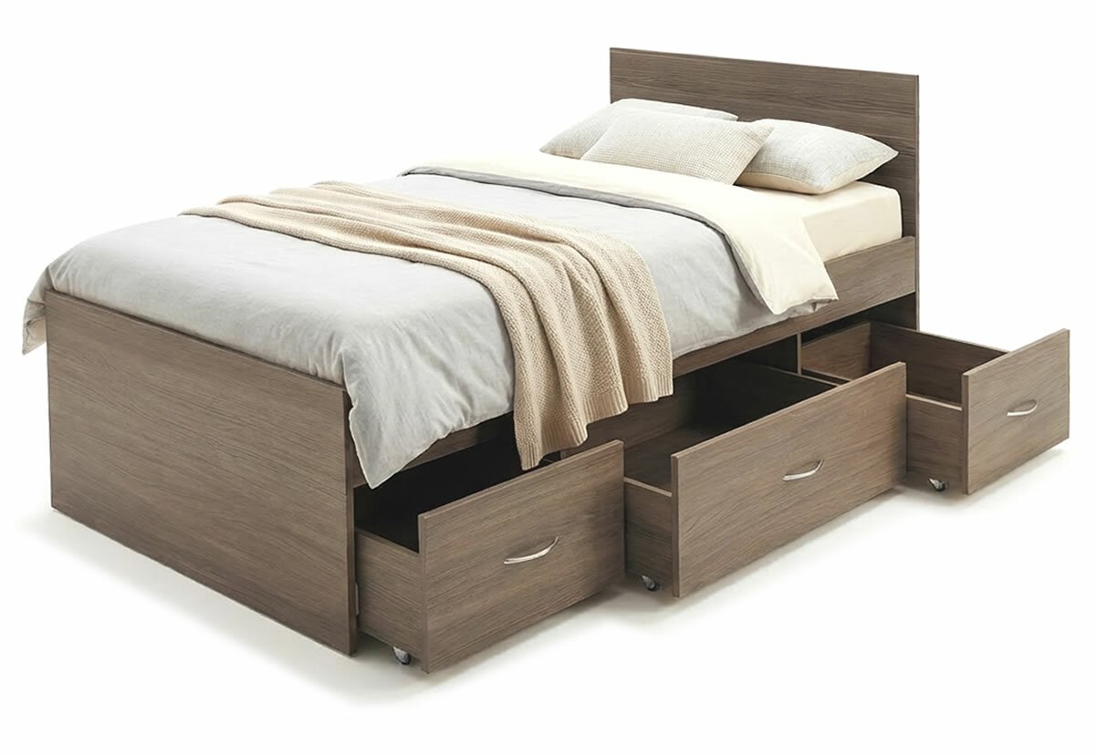 Zvýšená postel Delta je vyrobena z laminované dřevotřísky a nabízí možnost výběru z více barevných dezénů.